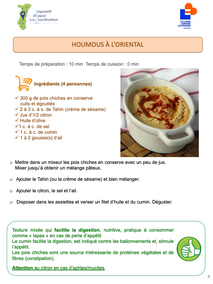 Texture mixée qui facilite la digestion, nutritive, pratique à consommer comme « tapas » en cas de perte d’appétit.